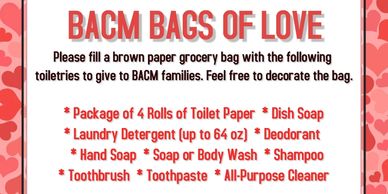 BACM does not spend donated funds on toiletries or paper goods. We will gladly accept donations from the community; such as toilet paper, soap, shampoo, laundry soap, toothbrushes and toothpaste.
